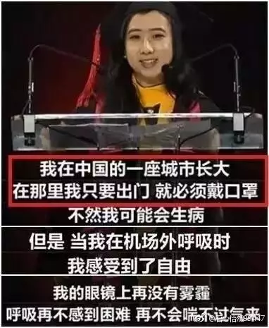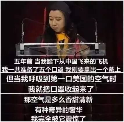 5月21日,中国云南昆明女留学生杨舒平在美国马里兰大学大学毕业典礼上演讲,称美国的空气又新鲜又甜美,说中国历史课学到的东西对她毫无意义,还表示自己在中国每天戴口罩出门。