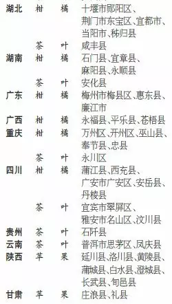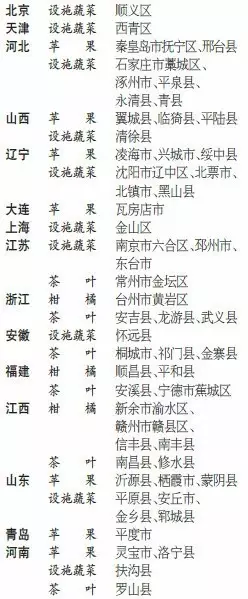 苹果示范县25个,柑橘示范县32个,设施蔬菜示范县22个,茶叶示范县21个